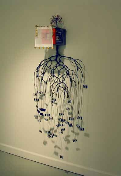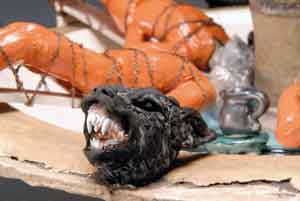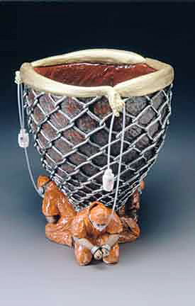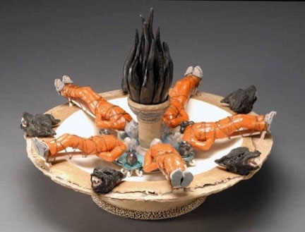 Low-fire clay, yarn, saran wrap, acrylics, and water