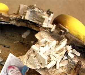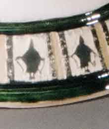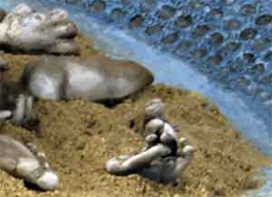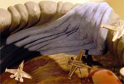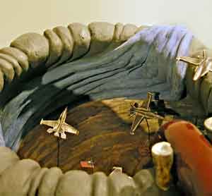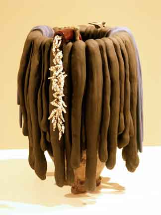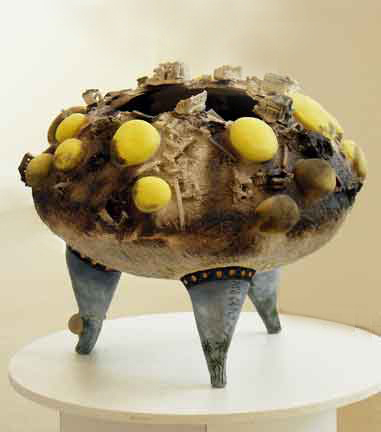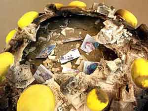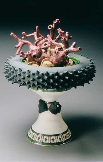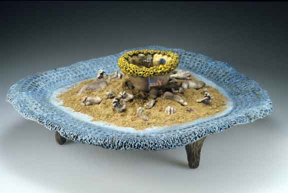 Low-fire clay, sawdust fired, acrylics, sand, decal and motor oil